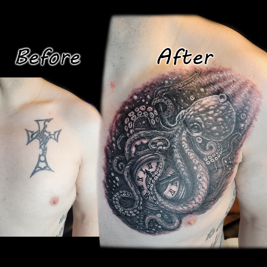 Before and after cover-up Tattoos done by Brian Martinez at Brian Tattoos in San Francisco California